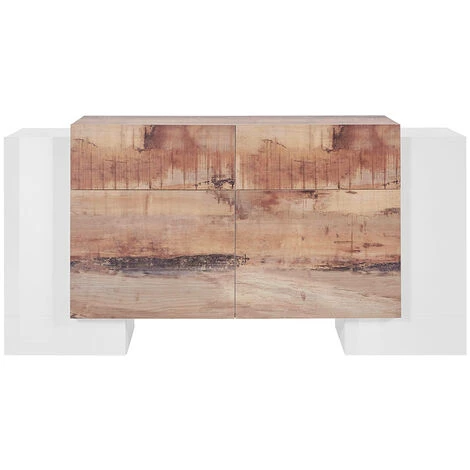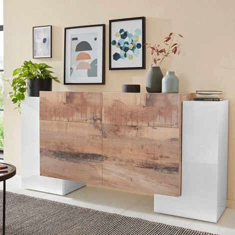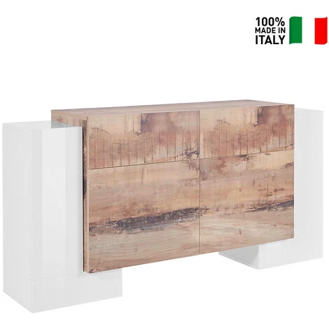 Made in Italy est synonyme de qualité et ce meuble ne fait pas exception : fabriqué par la marque spécialisée AHD avec des matériaux de premier choix, ce buffet présente des particularités qui le placent à un niveau supérieur par rapport aux articles proposés par la concurrence. Une finition en mélaminé blanc laquée brillante est appliquée sur la structure en bois certifié FSC, belle à regarder et facile à entretenir. L’espace de rangement est divisé entre deux portes latérales en forme de L (chacune avec une étagère), deux portes centrales avec une étagère intérieure et deux tiroirs.