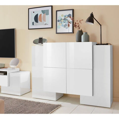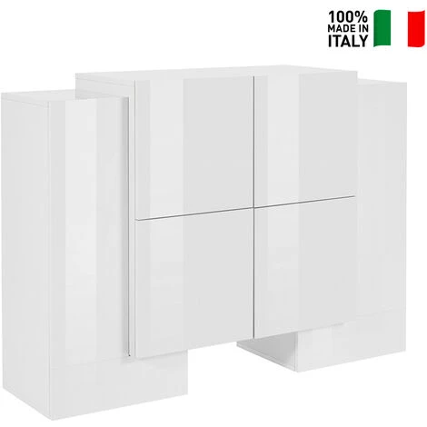 L’expression Made in Italy a toujours été synonyme de qualité et ce meuble ne fait certainement pas exception : fabriqué par la marque spécialisée AHD avec des matériaux de premier choix, ce buffet présente des particularités qui le placent à un niveau supérieur par rapport aux articles concurrents. Une finition en mélaminé blanc laquée brillante est appliquée sur la structure en bois certifié FSC, belle à regarder et facile à entretenir. L’espace de rangement est divisé entre les deux portes latérales en forme de L (chacune équipée de deux étagères) et les quatre compartiments intérieurs dissimulés par les quatre portes centrales battantes.