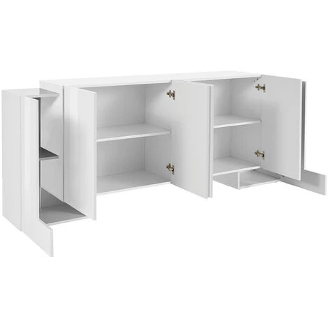 La structure est fabriquée en bois certifié FSC avec une finition en mélaminé blanc laqué brillant tandis que l’espace de rangement se divise entre deux portes latérales en forme de L (avec une étagère chacune) et quatre portes centrales avec ouverture battante, organisées intérieurement en quatre compartiments de deux étagères. Le montage est très simple et, en se référant pas à pas aux instructions de l’emballage, cela prendra quelques dizaines de minutes.