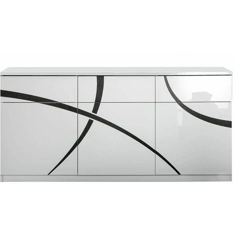 Structure en panneaux de particules, finition laqué blanc. Façades finition laqué blanc brillant. Ep. plateau : 22mm. Système d’ouverture Push Pull. Motif sur façades coloris noir.