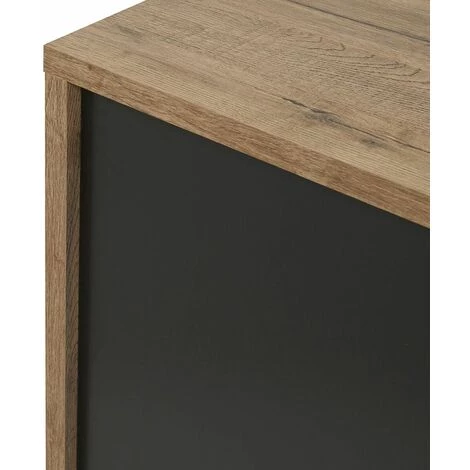 Structure en panneaux de particules. RevĂȘtement papier dĂ©cor bois naturel et bois noir. PiĂštement mĂ©tallique noir. Dispose de 4 portes et 1 tiroir.