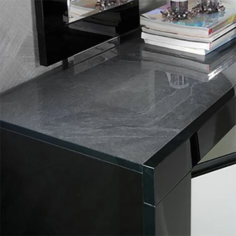 Structure en panneaux de particules, finition laqué noir brillant. Façade portes en panneaux de particules, finition laqué blanc brillant. Plateau de meuble en panneaux de particules, finition décor marbré. Motif vaguelettes finition pailletée sur la façade.