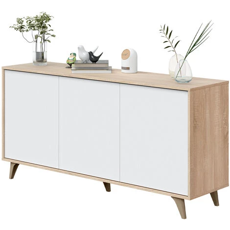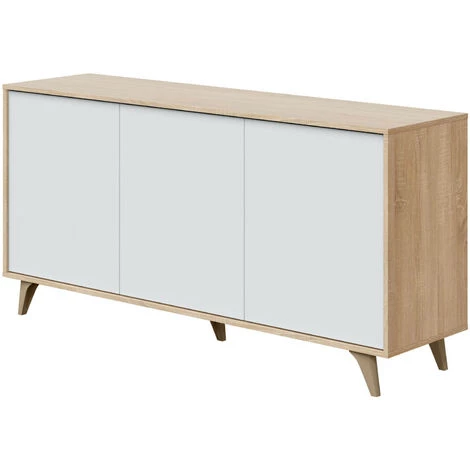 Buffet à trois portes avec système d’ouverture « push » et trois étagères internes avec structure couleur chêne et trois portes battantes blanches.