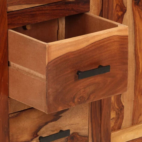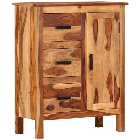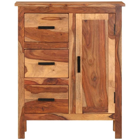Notre buffet en bois est la solution idéale pour ranger vos effets personnels. En même temps, il ajoutera une touche de style vintage à la décoration de votre salon. L’armoire latérale est fabriquée en bois massif de Sesham qui est très durable. Le Sesham est un bois dur tropical qui est non seulement célèbre pour ses grains riches, mais aussi connu sous le nom de bois de rose ou palissandre. Les trois tiroirs et l’armoire offrent suffisamment d’espace de rangement pour ranger vos petits objets et les protéger de la poussière. Le travail artisanal rehausse le style vintage de l’armoire. Chaque étape du processus de construction est réalisée avec le plus grand soin, que ce soit le polissage, la peinture et le laquage. Remarque importante : Les couleurs et les grains peuvent varier d’une pièce à l’autre, ce qui rend chaque pièce unique ; la livraison est aléatoire.