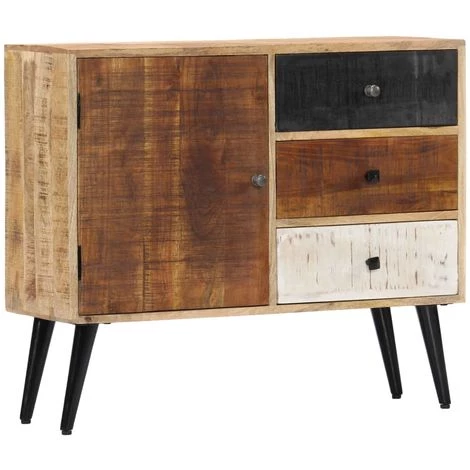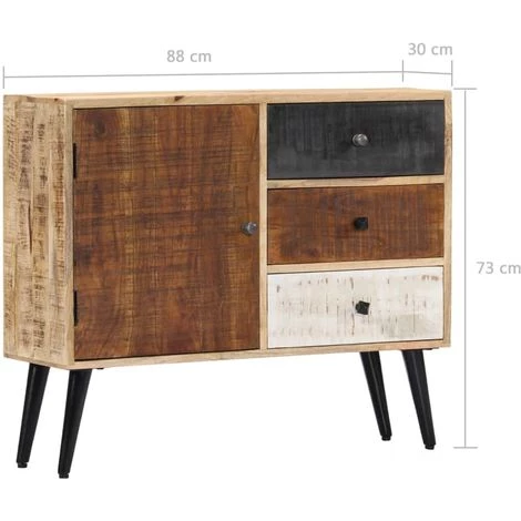 Apportez le luxe d’un design inspiré du milieu du siècle dans votre intérieur avec notre magnifique buffet ! Fabriquée en bois massif de manguier, le buffet a reçu une belle finition par polissage et laquage, ce qui lui donne un aspect raffiné. Le bois de manguier est un bois dur dense et robuste qui a de belles stries et des contours bruns ou dorés sur sa surface. Il dispose de 3 tiroirs et d’une porte, offrant un grand espace pour ranger vos chaussures, vos livres, ainsi que divers autres objets. Le buffet est facile à assembler et à nettoyer avec un chiffon humide. Remarque importante : les couleurs et les grains de bois peuvent varier d’une pièce à l’autre, ce qui rend chaque pièce unique et légèrement différente l’une de l’autre ; la livraison est aléatoire.