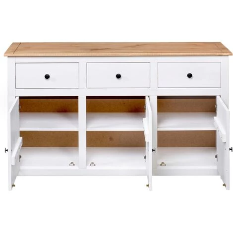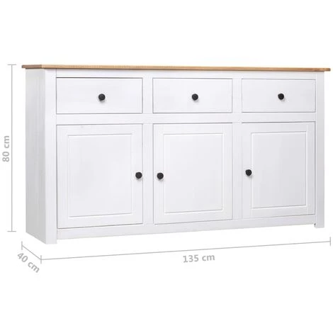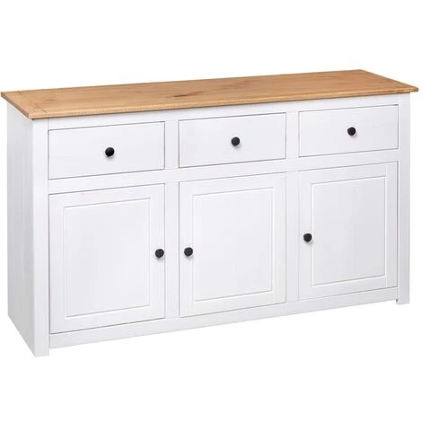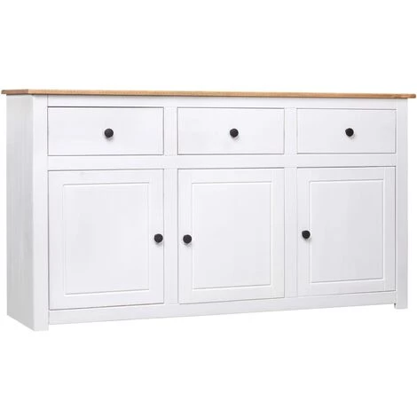 Introduisez un air d’élégance et de commodité dans votre intérieur avec notre buffet en pin massif ! Fabriqué en bois de pin massif, ce meuble à tiroirs est extrêmement durable et robuste. Le meuble latéral offre un grand espace de rangement avec 3 tiroirs et 3 compartiments. En outre, le dessus robuste est idéal pour afficher des objets décoratifs tels que des cadres photo, des plantes en pot, des vases, etc. Il est facile de nettoyer avec un chiffon sec. Le coffre de rangement est facile à assembler.