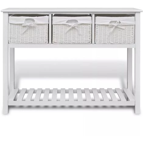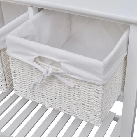 Ce buffet blanc de rangement, minimaliste romantique, avec paniers tissés présente une excellente solution de rangement pour la chambre à coucher, le couloir ou la salle de bain. Cette unité de stockage, faite de matériau de haute qualité, a trois paniers tissés et un niveau inférieur en lattes. Chaque panier a une doublure en tissu lavable. Les lattes aident à garder les articles stockés, ventilés et secs. Cette unité de rangement en bois deviendra l’un de vos meubles préférés !