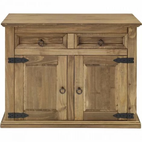 Bahut / Buffet. Structure en bois massif en pin. Poignés anneaux métalliques. Finition : laque acrylique et cire. Assemblement du haut : 31 mm. Cotés : 18 mm. Avant du tiroir : 38 mm. Portes : 18 mm. Etagere : 18 mm. Base 46 mm.