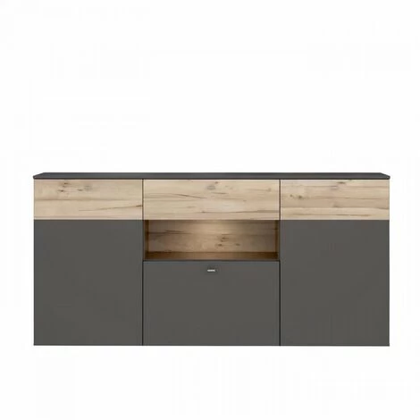 Buffet 3 portes 1 tiroir + LED – Décor chene et gris – L 194,8 x P 41,3 x H 94,5 cm – COMO