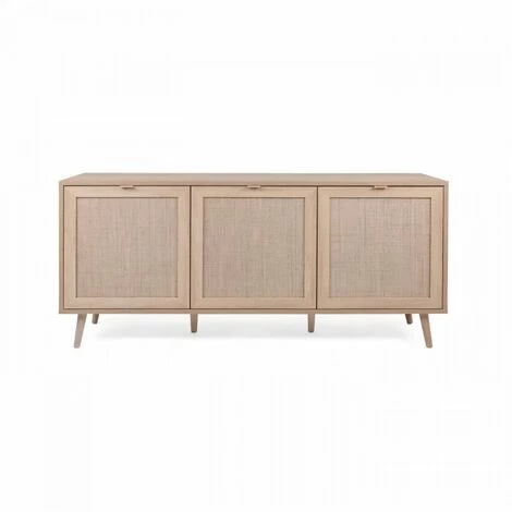 La gamme Bali est une série de meubles a l’aspect naturel grâce a l’impression sur panneau effet cannage et son coloris chene sonoma. Tantôt boheme, tantôt chic, ces meubles donneront du cachet a votre intérieur et sublimeront votre décoration végétale. Ce buffet de 150 cm de large avec ses trois portes ouvrantes est tres pratique et pourra se loger dans différentes pieces de votre intérieur. Ses pieds en bois massif permettent un maintien certain et lui offrent une qualité irréprochable. De plus, cerise sur le gâteau, cette collection est fabriqué en Union Européenne.