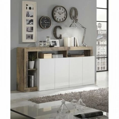Buffet Maestro 4 portes Finition Blanc Laqué & Effet Bois Vintage L184xH93xP42. style contemporain /Design – La collection Maestro joue la carte du design avec ses lignes épurées et intemporelles, optez pour ce buffet qui fera sensation dans votre salle a manger ou votre séjour ! Les deux finitions offrent un tres beau contraste au meuble pour une ambiance chic et chaleureuse dans votre piece – La façade laquée donne de la fraicheur a votre salon. Strucuture en panneau de particules effet bois vintage, Façade et Porte finition laquée haute densité avec traitement anti-rayure et anti-jaunissement. Fabrication Italienne. A monter soi-meme.