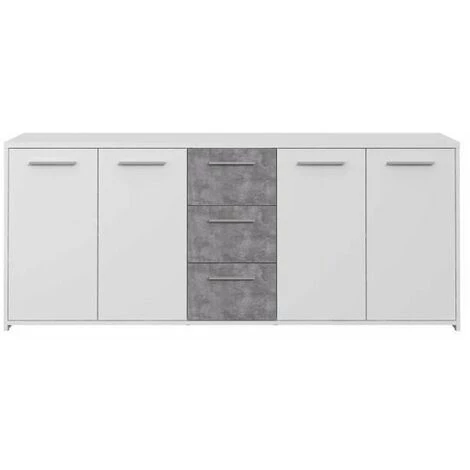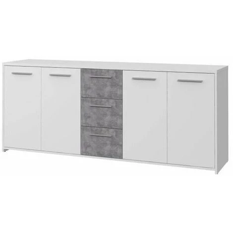 Buffet bas 4 portes 3 tiroirs – Blanc et décor gris béton – L 179 x P 42 x H 74,5 cm