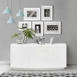 Ce buffet contemporain 3 portes avec systeme d’Ă©clairage LED, de la collection FLORENCE, apportera a votre sĂ©jour, tout le chic dont vous avez toujours revĂ©. Finition laque blanche haute brillance, portes et façade courbes avec motifs design en relief.