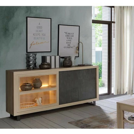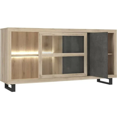 – 2 tablettes, push, pieds luges, Ă©clairage inclus, dĂ©cor bĂ©ton foncĂ© et chene clair
