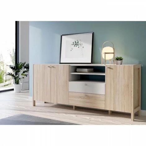 AUTRES Enfilade HOYVIK 3 Portes – 2 Tablettes, 2 Tiroirs, 2 Niches – 215,3 Cm – Décor Chene Sonoma Avec Du Blanc Mat – Poignées En M…
