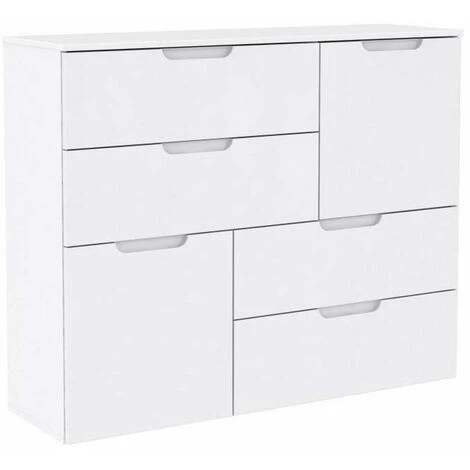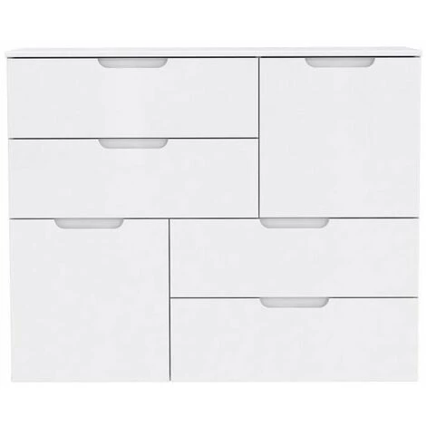 SIENNA Buffet corps blanc mat, faces et top en blanc brillant – Panneaux de particules et MDF combiné – Style et design contemporain – 2 portes, 4 tiroirs – Dimensions totales : L 115 x P 34 x H 93 cm – Fabrication européenne.