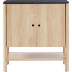 Buffet JAPENDI – 2 portes – Structure en panneaux de particules – Revêtement en papier décor noir et coloris bois – 4 pieds en MDF – Dimensions : L80 x P39 x H85 cm