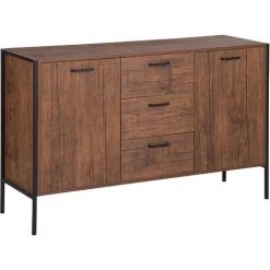 Meuble de rangement moderne avec 2 portes et 3 tiroirs. Ce buffet est un meuble classique et universel pour votre salon. Beaucoup d’espace de stockage est fourni par trois tiroirs spacieux et deux armoires. L’élégante couleur sombre et l’effet bois naturel se marient très bien avec les pieds et le cadre en métal en noir, créant un élément unique avec une touche industrielle.