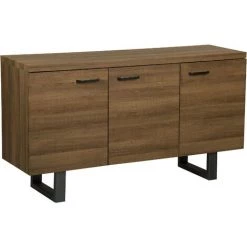 Commode moderne imitation en bois foncé avec 3 portes. Ajoutez une touche industrielle à votre salon ou votre chambre avec cette commode pratique. Fabriqué à partir de MDF durable, la pièce bénéficie d’une finition qui imite magnifiquement le grain naturel et les nœuds du bois. Il repose sur une base en métal gris qui lui donne une ambiance minimaliste.