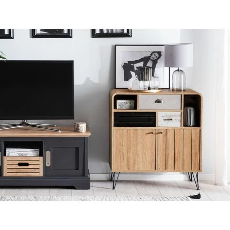 Commode composé de 3 tiroirs et 2 portes imitation bois. Ce petit buffet inspiré des tendances des années 60 et 70 s’intègre parfaitement dans tout schéma de design d’intérieur moderne. Le corps aux bords arrondis est fini en stratifié effet bois de chêne et placé sur des pieds en épingle à cheveux en métal. L’armoire fonctionne très bien dans n’importe quelle chambre, salon ou couloir. Le rangement fermé et trois tiroirs apportent un charme rétro à n’importe quelle pièce.