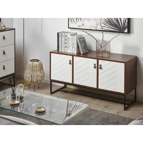 Commode buffet moderne avec 3 compartiments à portes. Si vous recherchez des meubles de rangement traditionnels avec une touche moderne, cette commode est un excellent choix. Fabriquée en MDF durable effet bois foncé et blanc, elle repose sur un piétement en métal noir. Ce buffet possède 3 compartiments à portes offrant un espace de rangement spacieux pour vos vêtements, livres et autres objets quotidiens. Remarquez les poignées design en cuir PU et le motif à chevron subtils, en effet cette commode a tout pour plaire et rehausser le look de votre chambre ou salon. Grâce à ses dimensions, elle peut aussi servir de meuble TV original et pratique.