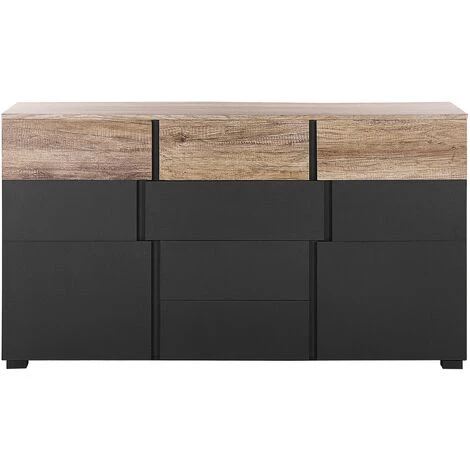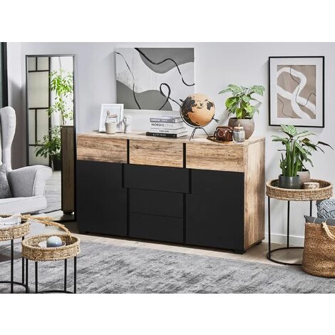 Commode design bicolore avec 2 compartiments Ă portes et 4 tiroirs. AmĂ©liorez votre confort de vie et dĂ©sencombrez votre maison. Cette commode au design moderne est dotĂ©e de 4 tiroirs spacieux, parfaits pour ranger les câbles inutilisĂ©s, les tĂ©lĂ©commandes ou les vieux magazines. Elle est Ă©galement dotĂ©e de 2 compartiments Ă portes avec une Ă©tagère chacun, vous permettant de cacher encore plus d’objets hors de vue de vos invitĂ©s. Cette commode est fabriquĂ©e Ă partir de bois d’ingĂ©nierie, nĂ©cessitant peu d’entretien, et peut rĂ©sister de nombreuses annĂ©es d’utilisation. On craque pour la combinaison de couleurs contrastĂ©es, celle du bois et du noir, et on adore le design moderne, lĂ©gèrement dĂ©structurĂ©. Ce buffet est un candidat sĂ»r pour devenir la star de votre salon.