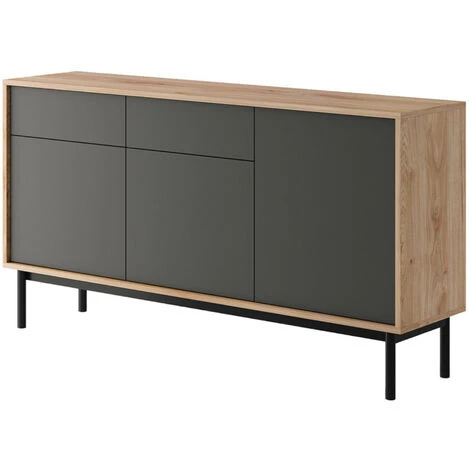 Le buffet Malo, de style industriel, dispose de trois armoires et deux tiroirs. Il n’y a pas de poignées traditionnelles, qui sont remplacées par un système « push-to-open » qui confère au meuble et donc à votre pièce un style minimaliste et loft. Les dimensions totales sont 154x84x39 cm.