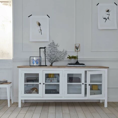 Atout charme de votre salon, craquez pour le buffet LONDRES et ses multiples rangements. Fabriqué en acajou et surmonté d’un épais plateau en teck, ce buffet est idéal pour recevoir linge de maison, livres et vaisselle en tous genres. Finition patinée du teck, pour un rendu authentique et robuste. Look raffiné pour une déco romantique, le buffet LONDRES est équipé de 4 portes battantes vitrées pour mettre en valeur votre déco et vos bibelots. Ses lignes sobres et ses finitions de qualité viennent s’harmoniser dans tous types d’intérieur, qu’ils soient classiques ou plus modernes.