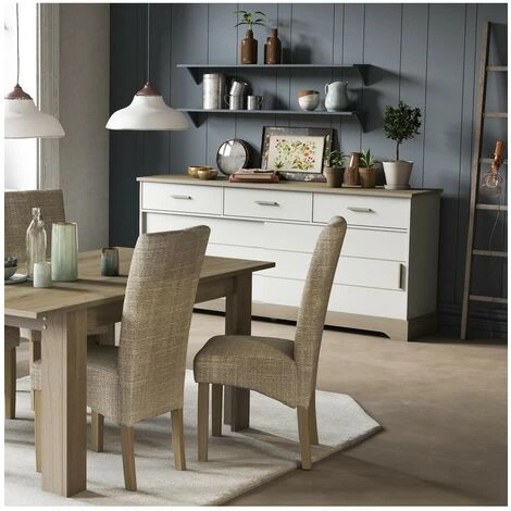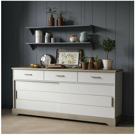 Avec son esprit authentique revisitĂ©, le Buffet 2 Portes Coulissantes 3 Tiroirs L200 cm – Cottage apporte charme et Ă©lĂ©gance au salon. Très fonctionnel, il offre un grand espace de rangement avec ses 3 tiroirs et ses 2 portes coulissantes. Son dessus et son piĂ©tement Ă©pais lui donnent un aspect robuste. Son dĂ©cor structurĂ© et les baguettes adhĂ©sives sur les portes donnent du cachet ce meuble.
