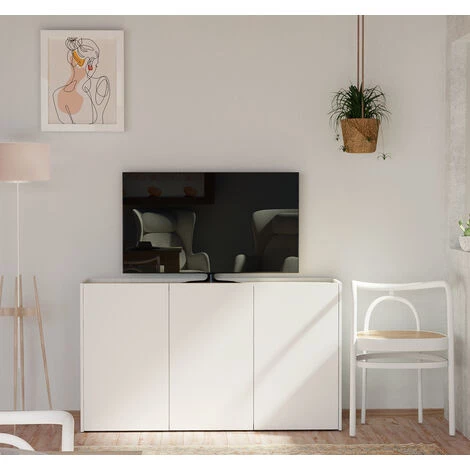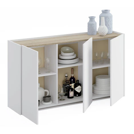 Buffet, en panneaux de particules et mélamine haute densité coloris Blanc/cambrian, avec 3 portes avec 3 étagères intérieures fixes. Profondeur interne utile: 37 cm. Produit de fabrication Espagnol certifié PEFC. Livré en kit. Dimensions : Hauteur 80 x Longueur 140 x Profondeur 40 cmDimensions intérieures : 4 niches : hauteur 34,5 x Longueur 44,5 x Profondeur 37 cm1 niche de : hauteur 21,5 x Longueur 44,5 x Profondeur 37 cm1 niche de : hauteur 47,5 x Longueur 44,5 x Profondeur 37 cmMatière : panneaux de particules et mélamine haute densitéColoris : Blanc/cambrianPoids : 46 kg