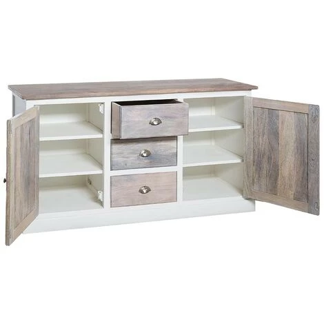 Vous appréciez le mobilier épuré ? Alors, laissez-vous tenter par le buffet en bois blanchi 2 portes 3 tiroirs d’Atmosphera. Ce meuble bas est en bois d’acacia avec un dessus de buffet en manguier. Vous craquerez pour ce meuble en bois finition blanchie qui comporte 3 tiroirs, 6 étagères soit 6 niches. Dimensions : L. 150 x l. 45 x H. 80 cm. Poids du produit : 70 kg. Matière : Acacia, manguier, MDF. Coloris : blanc