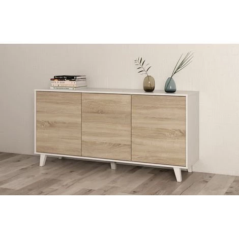 Buffet blanc brillant et décor chene canadien. Structure en panneaux de particules mélaminés. Composé de 3 portes battantes, avec 1 étagere derriere chaque porte. A monter soi-meme. Dimensions : L 154 x P 41 x H 75 cm. Matière : panneaux de particules mélaminés. Coloris : blanc brillant et chêne. Poids : 42 KG