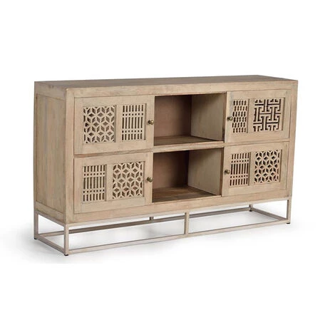 Buffet bahut à 4 portes coulissantes en bois de manguier et base en métal. Livré monté. Dimensions : longueur 160 x profondeur 40 x hauteur 91 cm Matière : bois de manguier, métalColoris : naturel Volume : 0,58 m³ Poids : 49 KG