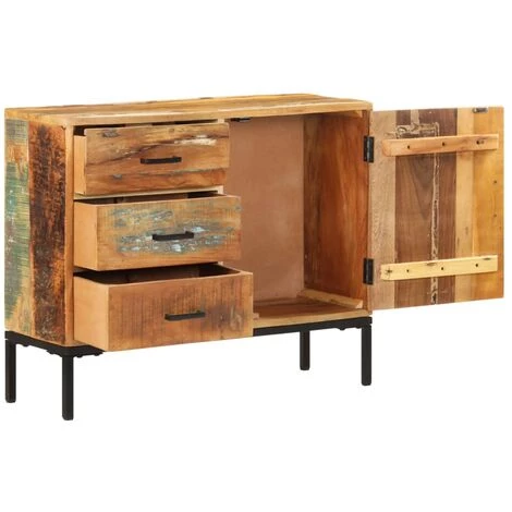 Cette armoire est fabriquée en bois massif de récupération qui provient des solives, des planchers et des poutres de soutènement des bâtiments anciens et démolis, ce qui en fait une option écologique pour la fabrication de meubles. Il s’agit d’un mélange de bois de récupération, y compris le pin, le teck, le hêtre, le bois de manguier, etc., ce qui signifie que le bois de récupération conserve les caractéristiques de ces différents types de bois. Le cadre en fer enduit de poudre apporte une stabilité supplémentaire. L’armoire latérale comprend 3 tiroirs coulissants et 1 porte pour garder des livres, des magazines et d’autres articles bien organisés et garder votre pièce bien rangée. De plus, le dessus robuste est idéal pour exposer des objets décoratifs, des cadres photo ou des plantes en pot.