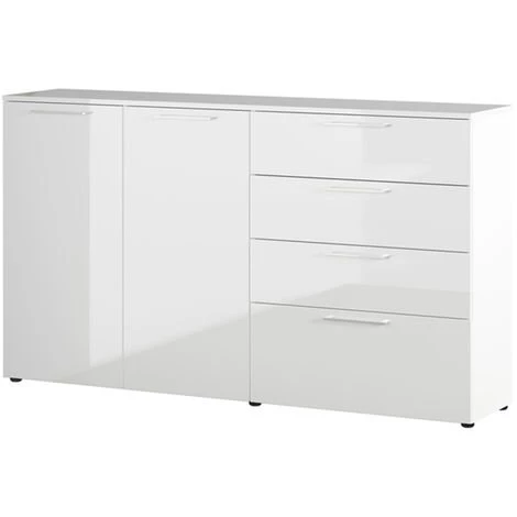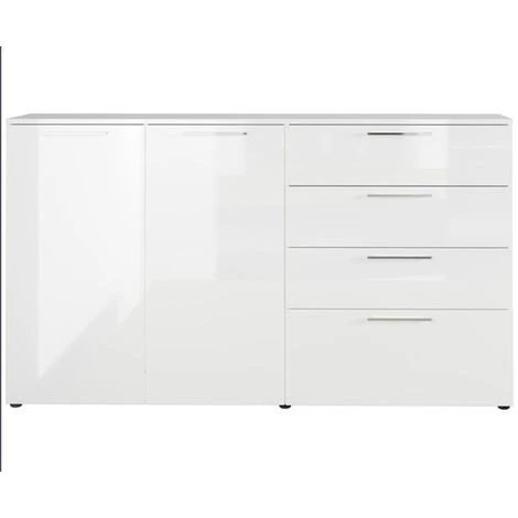 Commode avec quatre tiroirs à fermeture automatique (chacun pouvant supporter jusqu’à 10 kg) et deux portes – derrière chacune trois étagères réglables (chacune pouvant charger jusqu’à 10 kg); panneau supérieur chargeable jusqu’à 30 kg, panneau de base jusqu’à 15 kg ; corps en blanc; façades et panneau supérieur haute brillance en blanc; six poignées de garde-corps en métal chromées; sept patins de meubles noirs; revêtement en résine mélaminée, façade et surface supérieure en MDF thermoformé. Taille de l’article (L x H x P) : 186 x 107 x 40 cmCouleur : blancPoignées : garde-corps chroméesMatiéres : thermoformé / aggloméré / Surface supérieure enduite de résine de mélaminePoids de l’article : 88,03 kg