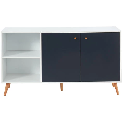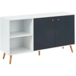 Buffet style scandinave blanc et gris, en panneau de particule finition papier stratifié avec 2 portes et 2 niches de rangement, 5 pieds en bois de hêtre. Ce buffet exceptionnel ajoutera une touche moderne à votre salon. Dimensions : 140 x 39,5 x 75 cm. Matériel : panneau de particule. Couleur : blanc et gris
