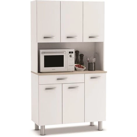 Optez pour ce pratique et esthétique buffet de cuisine de Buffet 6 portes, 1 tiroir en panneaux de particules de 15 mm. Dessus en 18 mm. 3 portes supérieures, 1 rayon réglable sur 3 niveaux + 1 rayon réglable sur 3 niveaux. 1 grande niche. 1 tiroir monté sur coulisses métal. Poignée X Press gris laqué, entraxe 12,8 cm. 3 portes inférieures, 1 rayon réglable sur 3 niveaux. 4 pieds plastiques, gris alu, hauteur 14 cm. Il vous permettra de ranger de manière organisée votre vaisselle et tout autre objet du quotidien. Meuble en panneaux de particules, décors mélamine imitation acacia/blanc mat, ce meuble de cuisine allie solidité, modernité et fonctionnalité. A monter soi-même. Dimensions : 101 x 185,3 x 42,3 cm. Structure : panneaux de particules. Couleur : Acacia/blanc mat. Poids : 61 kg