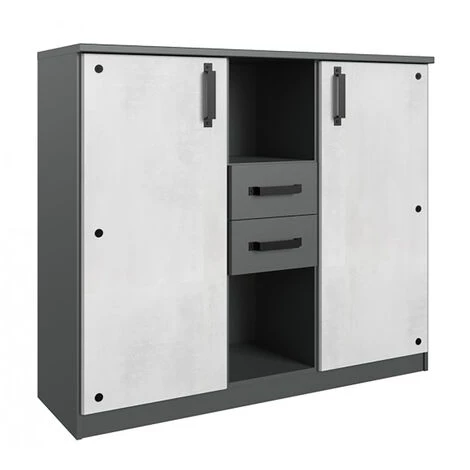 Buffet /Meuble de rangement en panneaux de particules mélaminés coloris imitation béton clair/graphiteDe 2 portes , 2 tiroirs et 2 nichesLivré en kitDimensions : Longueur 124 x Hauteur 105 x Profondeur 41 cmMatière : panneaux de particules mélaminésCouleur : imitation béton clair/graphitePoids : 54 kg