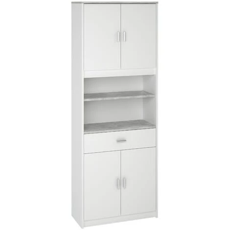 Buffet avec 4 portes , 2 niches et 1 tiroir (charnières et glissières métalliques). Fabriqué en panneaux de particules haute densité 16mm d’épaisseur avec décor et finition mélamine de qualité. Produit de fabrication Espagnol certifié PEFC. Livré en kit. Dimensions : Hauteur 180 x Longueur 67 x Profondeur 31 cmMatière : panneaux de particules mélaminésColoris : blanc / gris bétonPoids : 30 kg