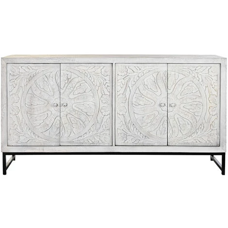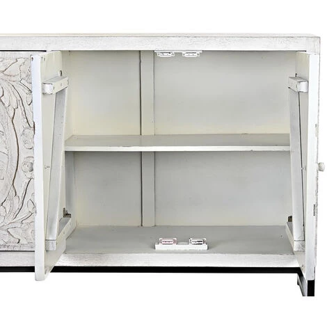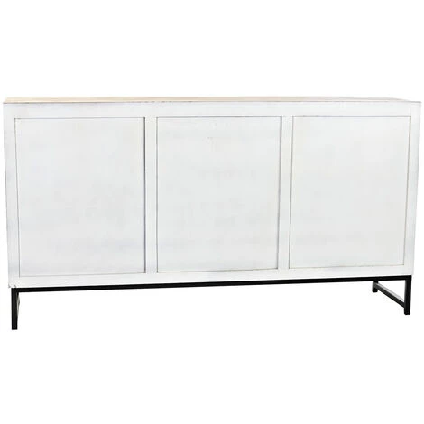 Buffet / Meuble de rangement en bois de manguier coloris blanc et métal noir de 4 portes.Dimensions : Longueur 150 x Hauteur 80 x Profondeur 38 cmDimensions porte : Longueur 35 x Hauteur 57 x Profondeur 7 cmDistance entre étagères: 30 cmMatière : bois de manguier, métalCouleur : blancPoids : 40 kg