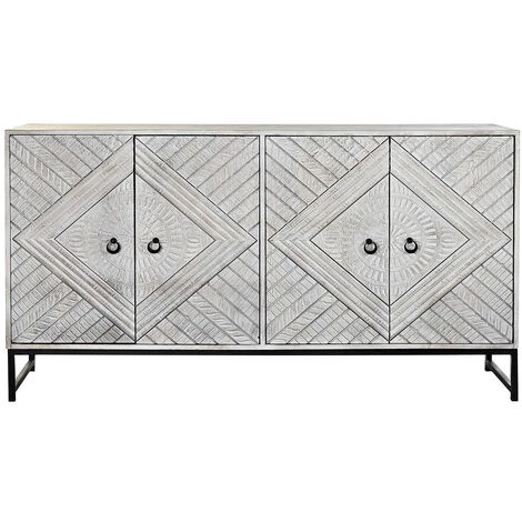 Buffet / Meuble de rangement en bois de manguier coloris blanc et métal noir de 4 portes.Dimensions : Longueur 155 x Hauteur 80 x Profondeur 40 cmDimensions porte : Longueur 37 x Hauteur 66 x Profondeur 6 cmDistance entre étagères: 32 cmMatière : bois de manguier, métalCouleur : blanc , noirPoids : 40 kg