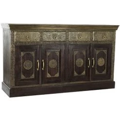 Buffet / meuble de rangement en bois de manguier marron foncé et laiton coloris doré de 4 portes et 4 tiroirs.Dimensions : Longueur 175 x Hauteur 101 x Profondeur 50 cmDimensions porte : Longueur 37 x Hauteur 56 x Profondeur 3 cmDimensions tiroir : Longueur 30 x Profondeur 32 cmDistance entre étagères: 27 cmMatière : bois de manguier , laitonCouleur : marron/ doréPoids : 80 kg