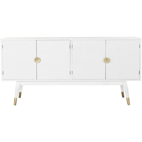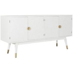 Buffet / Meuble de rangement en bois de sapin coloris blanc de 4 portes.Dimensions : Longueur 160 x Hauteur 80 x Profondeur 42 cmMatière : bois de sapinCouleur : blanc / doréPoids : 20 kg