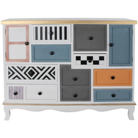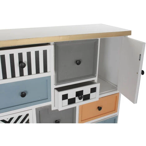 Buffet / meuble de rangement en bois multicolore de 2 portes et 9 tiroirs.Dimensions : Longueur 115 x Hauteur 90 x Profondeur 37 cmDimensions porte : Longueur 20 x Hauteur 38 x Profondeur 4 cmDimensions tiroirs : Longueur 33 x Profondeur 34 cmDistance entre étagères : 26cmMatière : bois Couleur : multicolorePoids : 18 kg