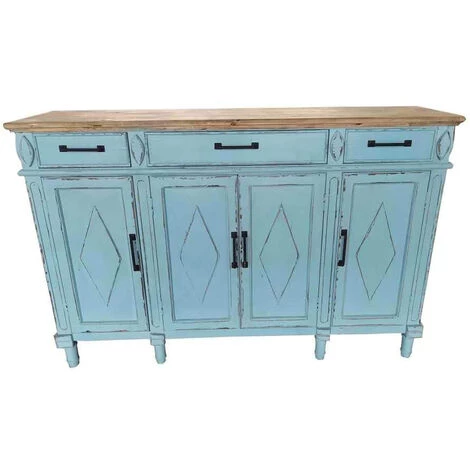 Buffet / Meuble de rangement en bois vieilli bleu ciel de 4 portes et 3 tiroirs.Dimensions : Longueur 158 x Hauteur 105 x Profondeur 42 cmDimensions tiroir : Longueur 65 x Profondeur 37 cmDimensions porte : Longueur 32 x Hauteur 67 x Profondeur 7 cmMatière : boisCouleur : vieilli bleu cielPoids : 50 kg