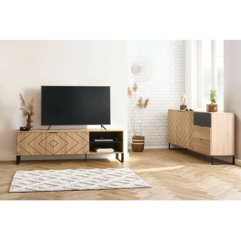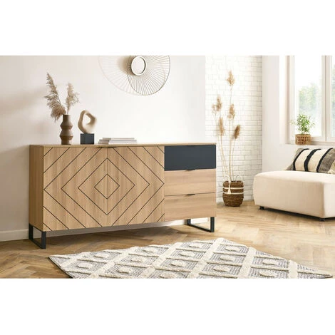 Optez pour ce buffet équipé de 2 portes et 3 tiroirs. Fabriqué en mélamine effet chêne, il est recouvert de lignes effet losange sur les 2 portes pour un design unique. Ses poignées et ses pieds en métal noir apportent du caractère au meuble.