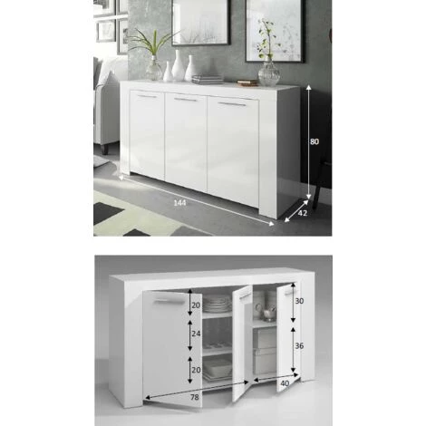 Buffet 144×80 cm Blanc mat avec trois portes et trois étagères intérieures