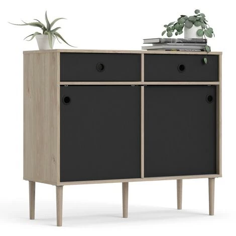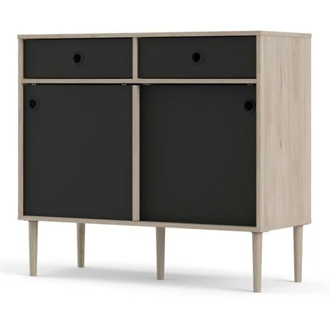 Buffet salon 99×40 cm noir mat et chêne clair avec deux portes coulissantes et deux tiroirs