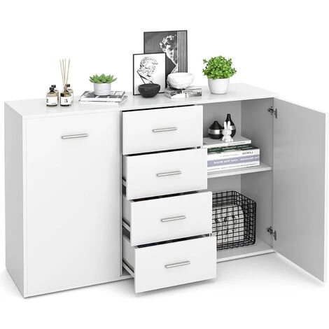 - 【Grand Espace de Rangement :】Ce buffet armoire a 4 tiroirs et 2 portes, avec une étagère supérieure surdimensionnée pour un espace de stockage idéal accru. Les étagères réglables à trois couches intégrées optimisent l’espace de stockage pour les nécessités quotidiennes.