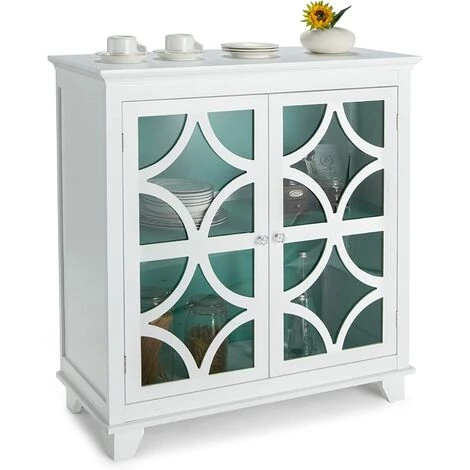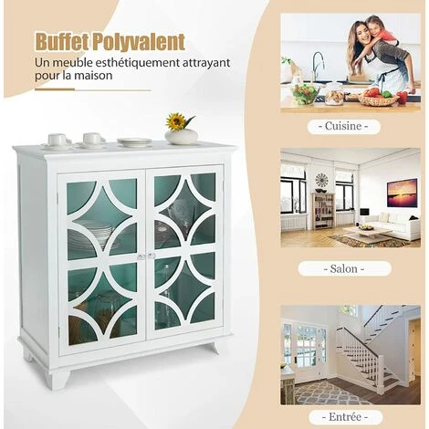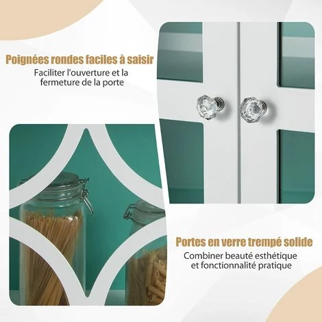 - Avec un large comptoir et un placard à 2 portes, ce meuble de rangement offre amplement d’espace pour la vaisselle, l’argenterie ou d’autres effets personnels. L’étagère réglable à 3 positions vous permet de mettre des objets de différentes tailles. Vous pouvez ouvrir la porte facilement grâce à la poignée pratique et aux charnières de haute qualité. Grâce au dispositif antibasculement, vous n’avez pas à vous soucier des buffets qui basculent accidentellement. Ce buffet pratique avec des portes vitrées décoratives vous aidera à ranger et votre décoration atteindra un niveau supérieur. Ce sera un meuble esthétiquement attrayant pour le salon et la cuisine.